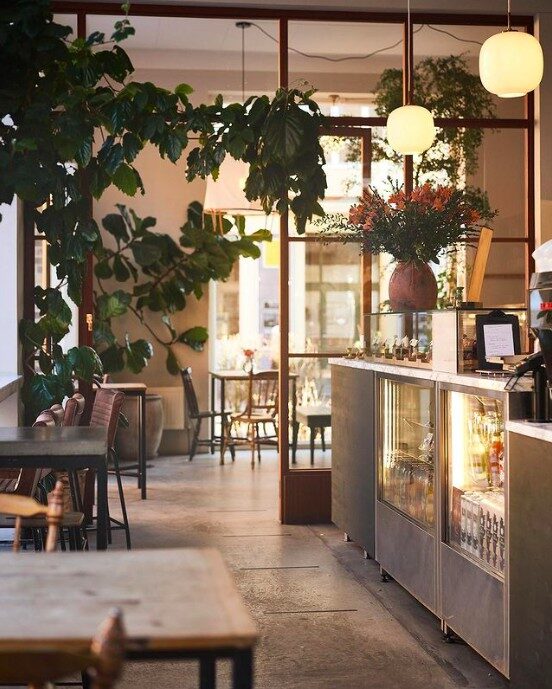 Ljus och grönska dominerar både lokalen med stora fönster mot Skvadronsgatan, och den charmiga uteserveringen. Det är faktiskt så ljust att stora träd frodas till och med inne på caféet, och att sitta här känns som att få en liten tids stilla respit från världens hets och jäkt utanför...